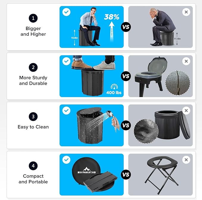 - ALL IN 1 PORTABLE TOILET KIT FOR ADULTS - The package includes 1 camping toilet, 1 privacy pop up tent, 1 potable carry bag, 1 instruction manual, 4 ropes, 4 ground stakes, and 12 waste bags. The innovative design allows for quick unfolding and setup. Our portable toilet is perfect for “Got To Go Now!” events.