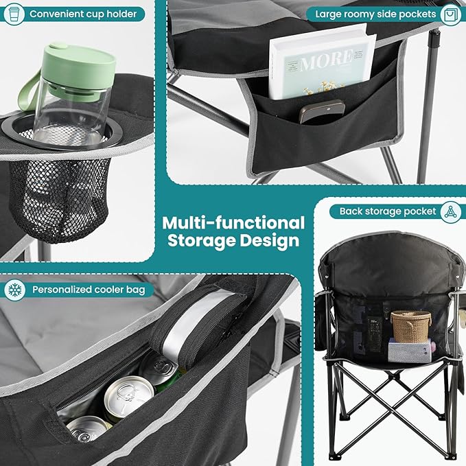- 【Smart Storage Solutions】Stay organized outdoors!This folding chair includes a mesh cup holder,side pocket for phones/keys, a cooler bag for drinks, and a back storage pouch for essentials. Perfect for keeping snacks,maps or sunscreen handy during beach trips or camping!